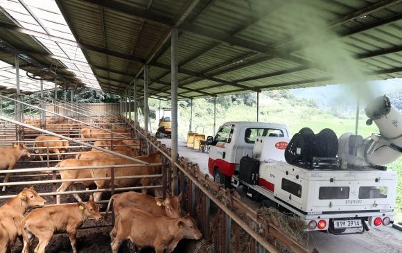 지난 7일 광주 북구 충효동 한 축사에서 구청 동물정책팀 직원들이 축사 온도를 낮추기 위해 물을 뿌리고 있다. [이미지 출처=광주 북구청 제공]
