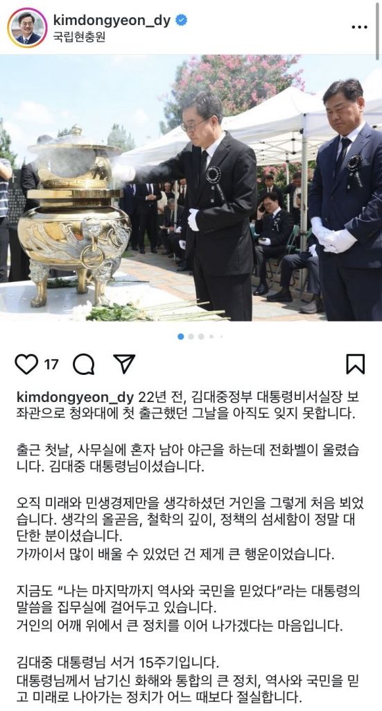 나아가 "거인의 어깨 위에서 큰 정치를 이어 나가겠다는 마음"이라며 "(오늘은) 김대중 대통령 서거 15주기이고, 대통령께서 남기신 화해와 통합의 큰 정치, 역사와 국민을 믿고 미래로 나아가는 정치가 어느 때보다 절실하다"고 덧붙였다.
