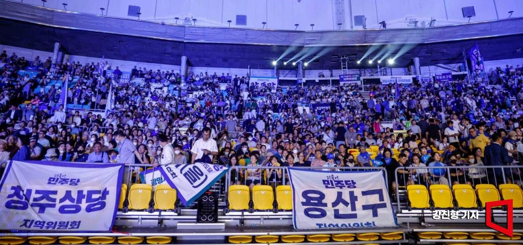 18일 서울 송파구 올림픽체조경기장에서 열린 '2024년 더불어민주당 제1차 정기전국당원대회'에 참가한 당원들이 환호하고 있다.