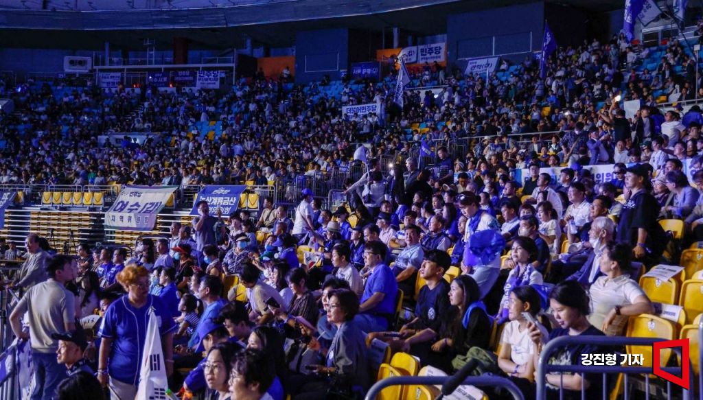 18일 서울 송파구 올림픽체조경기장에서 열린 '2024년 더불어민주당 제1차 정기전국당원대회'에 참가한 당원들이 환호하고 있다. 사진=강진형 기자aymsdream@