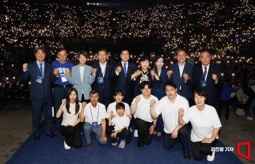 박찬대 더불어민주당 대표 직무대행 겸 원내대표와 지도부 및 당원들이 18일 오후 서울 송파구 올림픽공원 KSPO돔에서 열린 더불어민주당 제1차 정기전국당원대회에서 당원주권 비전선포식 퍼포먼스를 하고 있다.