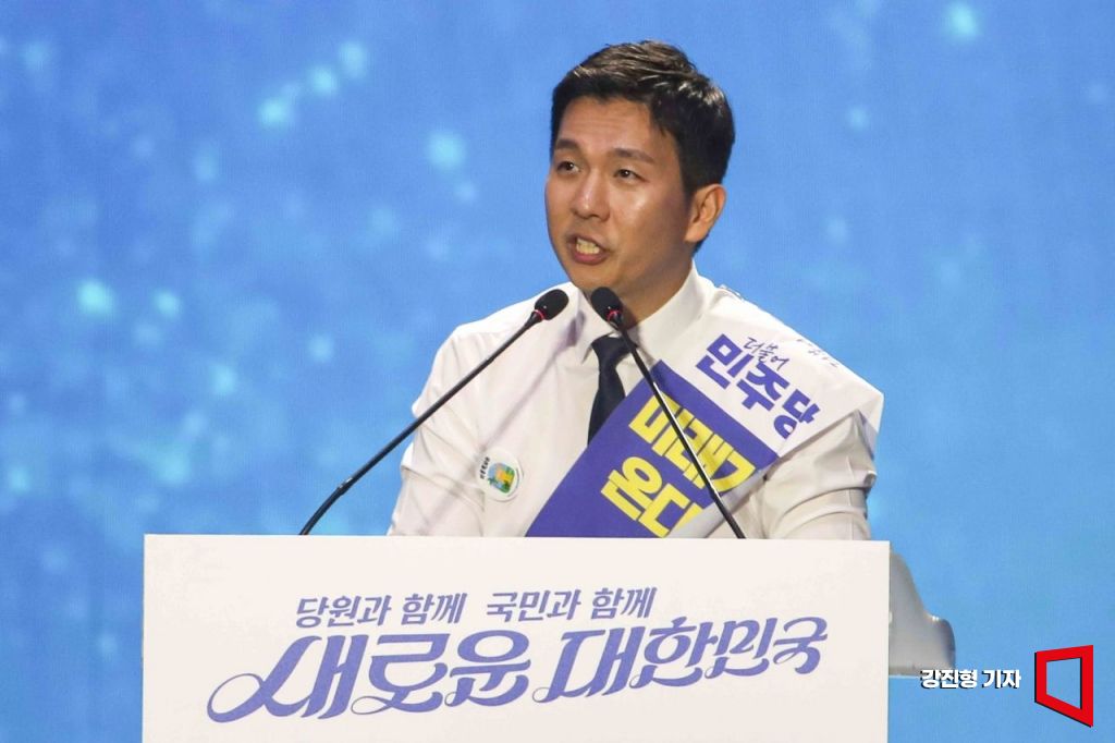 김지수 더불어민주당 당대표 후보가 18일 서울 송파구 올림픽체조경기장에서 열린 '2024년 더불어민주당 제1차 정기전국당원대회'에서 정견발표 하고 있다.