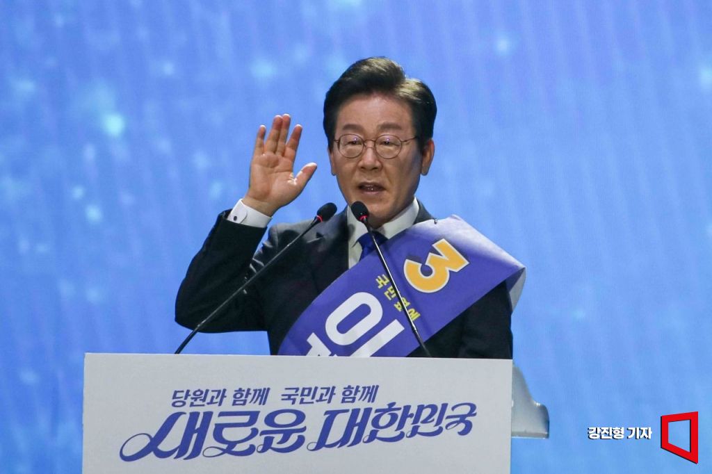 이재명 더불어민주당 당대표 후보가 18일 서울 송파구 올림픽체조경기장에서 열린 '2024년 더불어민주당 제1차 정기전국당원대회'에서 정견발표 하고 있다.