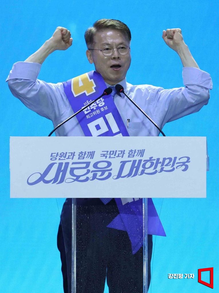 민형배 더불어민주당 최고위원 후보자가 18일 서울 송파구 올림픽공원 KSPO돔에서 열린 제1차 전국당원대회에서 정견발표를 하고 있다.
