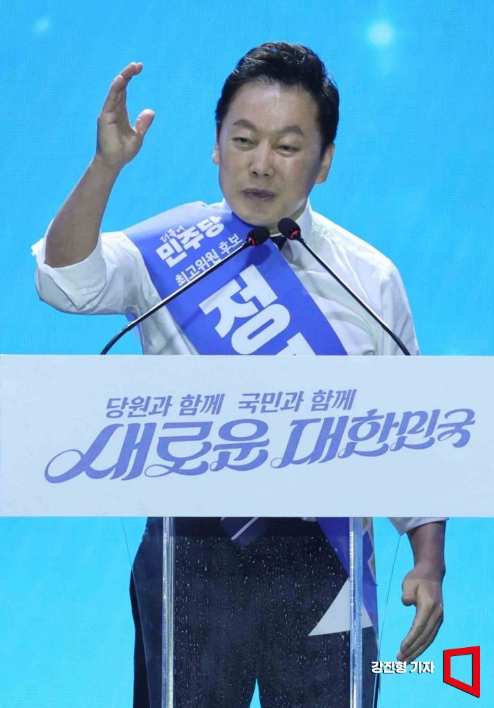 정봉주 더불어민주당 최고위원 후보자가 18일 서울 송파구 올림픽공원 KSPO돔에서 열린 제1차 전국당원대회에서 정견발표를 하고 있다.