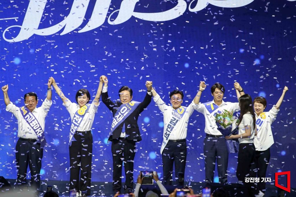 이재명 더불어민주당 당대표 당선인을 비롯한 최고위원 당선인들이 18일 서울 송파구 올림픽공원 KSPO돔에서 열린 '2024년 더불어민주당 제1차 정기전국당원대회'에서 당원들에게 인사하고 있다.