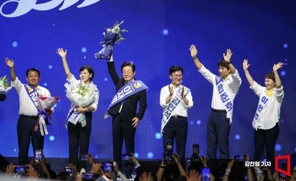 이재명 더불어민주당 당대표 당선인을 비롯한 최고위원 당선인들이 18일 서울 송파구 올림픽공원 KSPO돔에서 열린 '2024년 더불어민주당 제1차 정기전국당원대회'에서 당원들에게 인사하고 있다.