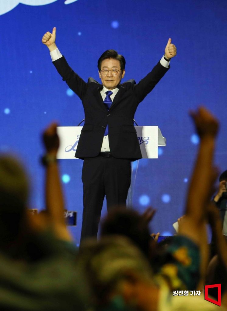이재명 더불어민주당 당대표 당선인이 18일 서울 송파구 올림픽공원 KSPO돔에서 열린 '2024년 더불어민주당 제1차 정기전국당원대회'에서 수락연설을 마친 뒤 당원들에게 인사하고 있다.