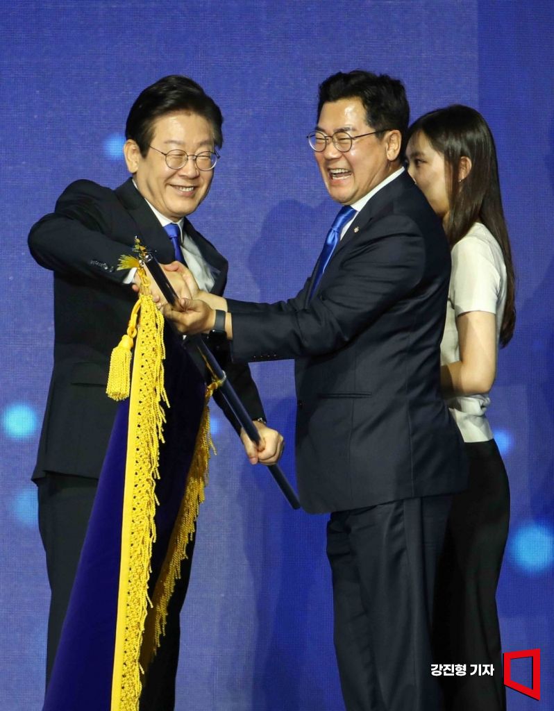이재명 더불어민주당 당대표 당선인이 18일 서울 송파구 올림픽공원 KSPO돔에서 열린 '2024년 더불어민주당 제1차 정기전국당원대회'에서 박찬대 원내대표에게 당기를 전달 받고 있다.