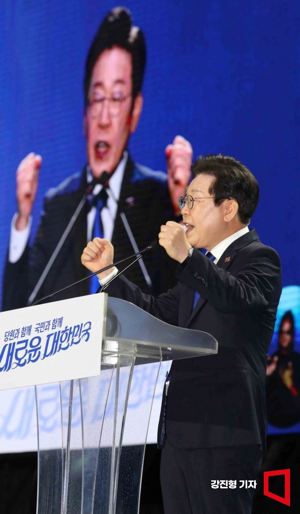 이재명 더불어민주당 당대표 당선인이 18일 서울 송파구 올림픽공원 KSPO돔에서 열린 '2024년 더불어민주당 제1차 정기전국당원대회'에서 수락연설을 하고 있다.