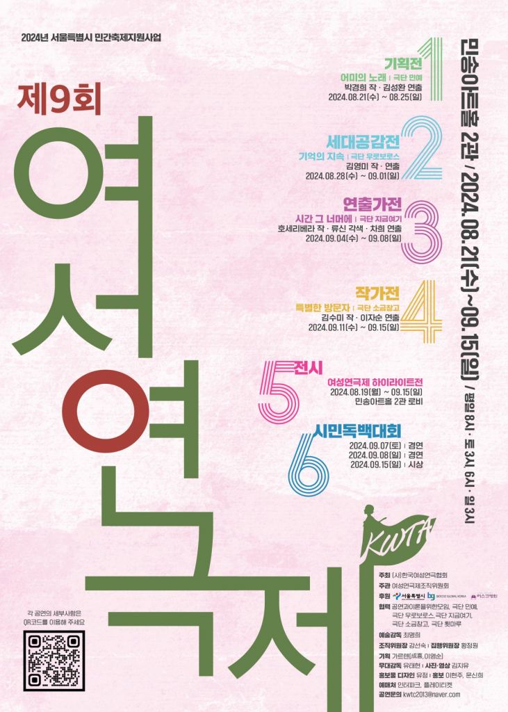 '제9회 여성연극제'가 오는 21일 개막한다. 이날 서울 대학로 민송아트홀에서 열리는 개막식을 시작으로 내달 15일까지 공연과 전시 등 다채로운 행사를 선보인다.