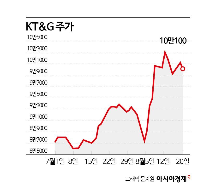 21일 한국거래소에 따르면 KT&G는 전날 종가 기준 10만100원(-0.99%)을 기록했다. 지난 13일 장중 한때 10만4300원까지 오르며 52주 신고가를 경신한 후 횡보하고 있지만 이달 초 '블랙먼데이' 이후 수익률은 14.66%에 이른다. 국내 증시에서 대표적인 경기방어주로 불리며 주가 변동 폭이 크지 않은 평소 모습과는 다른 강세를 연출했다.