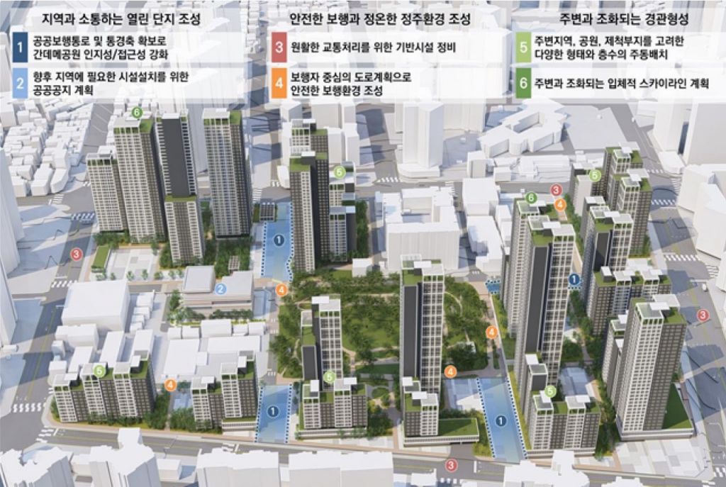 공원 주변은 최고 45층의 탑상형 주동을 배치하고, 가로변과 인접 주거지 및 제척부지 주변은 중·저층의 판상형 주동을 설계했다. 가로변 저층부에는 상가를 배치한다.