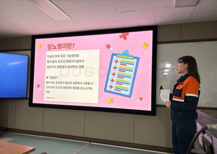 포스코 포항제철소 산업보건센터 전담 간호사가 회의실에서 당뇨병 예방 교육을 실시하고 있다.