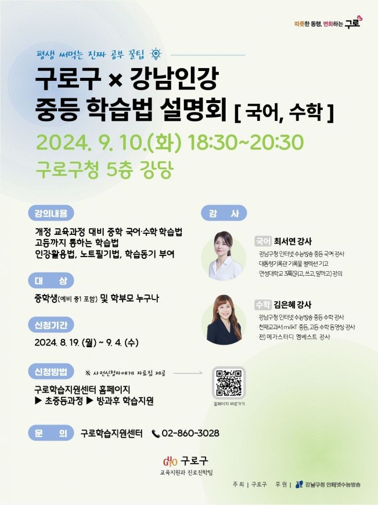 구로구(구청장 문헌일)는 9월 10일 구청 강당에서 진행되는 ‘구로구-강남인강 중등 학습법 설명회’ 참여자 150명을 선착순 모집한다.
