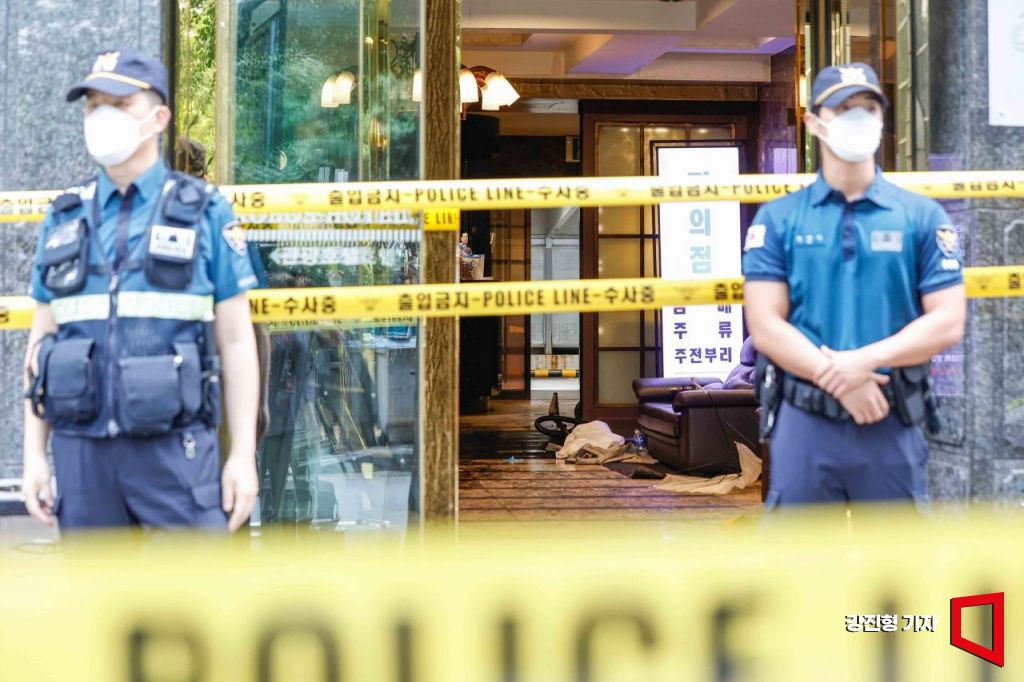 23일 경기 부천 호텔 화재 현장 내부에 여행객 짐으로 보이는 물건들이 바닥에 흩어져 있다. 이번 화재는 어제 저녁 7시 40분쯤 시작돼 투숙객 등 7명이 숨지고 12명이 다쳤다.