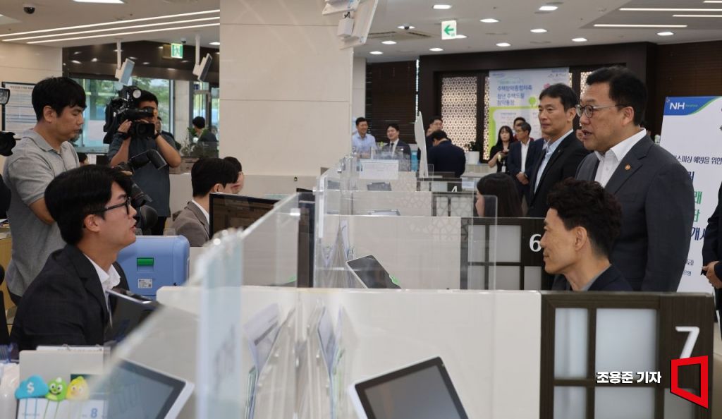 23일 서울 중구 충정로 NH농협은행 본점에서 열린 여신거래 안심차단 시행 관련 현장 간담회에 참석한 김병환 금융위원회 위원장, 이복현 금융감독원장이 영업장을 방문해 살펴보고 있다. 사진=조용준 기자 jun21@
