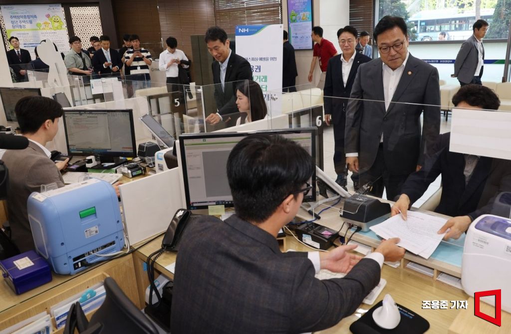 23일 서울 중구 충정로 NH농협은행 본점에서 열린 여신거래 안심차단 시행 관련 현장 간담회에 참석한 김병환 금융위원회 위원장, 이복현 금융감독원장이 영업장을 방문해 살펴보고 있다. 사진=조용준 기자 jun21@