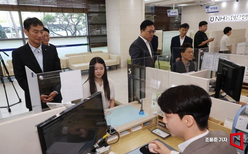 23일 서울 중구 충정로 NH농협은행 본점에서 열린 여신거래 안심차단 시행 관련 현장 간담회에 참석한 김병환 금융위원회 위원장, 이복현 금융감독원장이 영업장을 방문해 살펴보고 있다. 사진=조용준 기자 jun21@