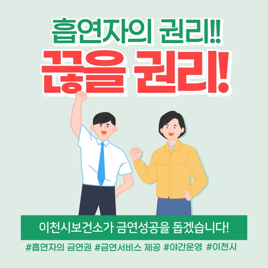 야간 금연 클리닉은 매주 첫째 주 수요일 오후 6시부터 2시간 동안 이천시보건소에서 열린다. 금연 클리닉에 등록하면 6개월간 1대1 맞춤형 금연 상담과 함께 금연보조제와 금연 행동 강화 물품(껌·사탕 등)을 받을 수 있다. 또한 일산화탄소 검사 또는 코티닌 측정을 통해 6개월 금연 성공자에게는 소정의 기념품도 제공한다.