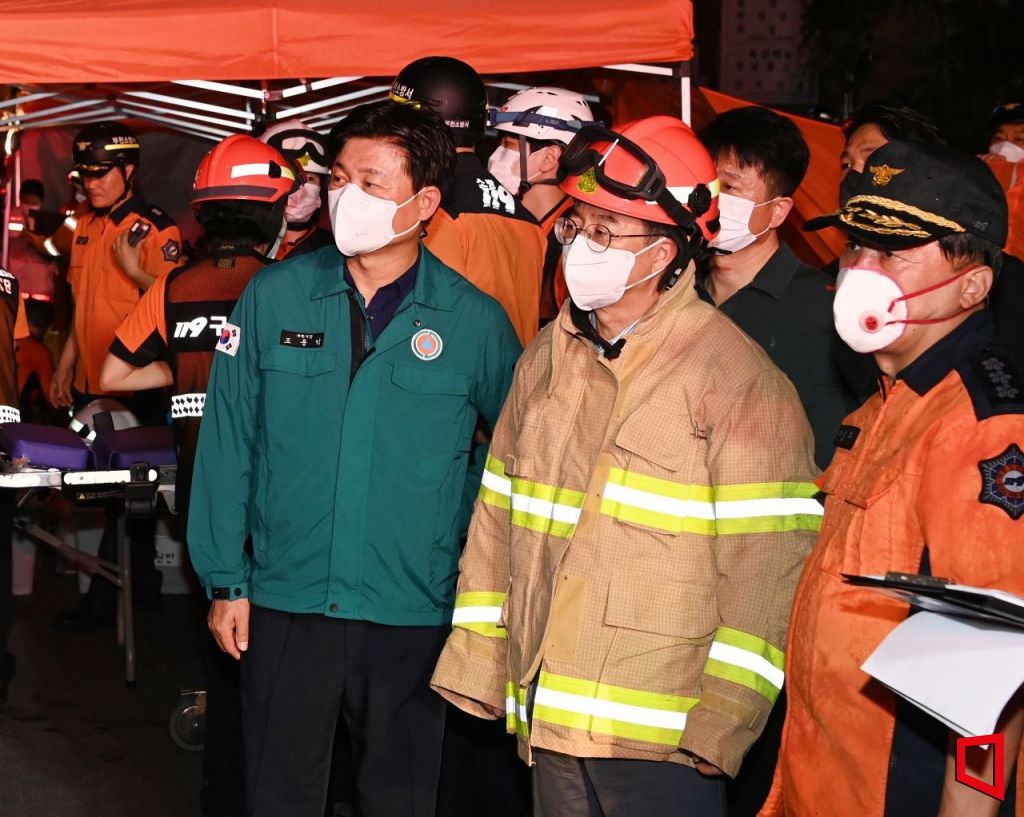 김동연 경기도지사(가운데)와 조용익 부천시장(왼쪽)이 22일 부천 중동 호텔 화재 현장을 살피고 있다. [사진 제공=부천시]