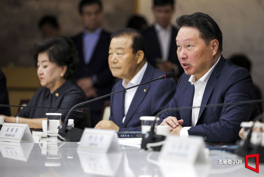 최태원 대한상공회의소 회장이 23일 서울 중구 대한상공회의소에서 열린 사회적 대화를 위한 국회의장-대한상의 간담회에서 인사말을 하고 있다. 사진=조용준 기자 jun21@