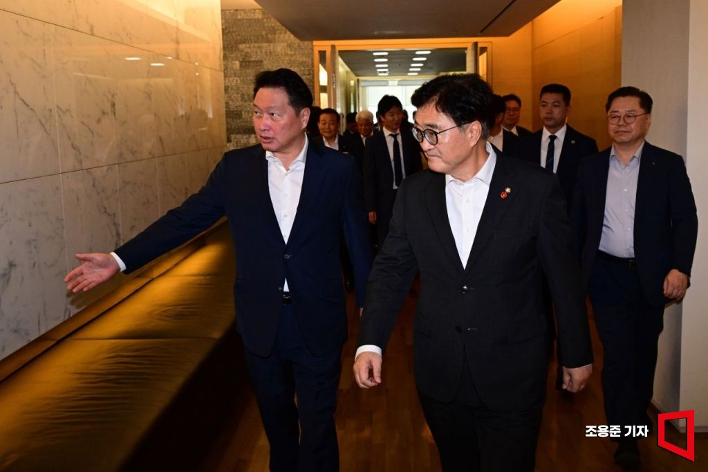 우원식 국회의장과 최태원 대한상의 회장이 23일 서울 중구 대한상공회의소에서 열린 사회적 대화를 위한 국회의장-대한상의 간담회에 참석하고 있다. 사진=조용준 기자 jun21@
