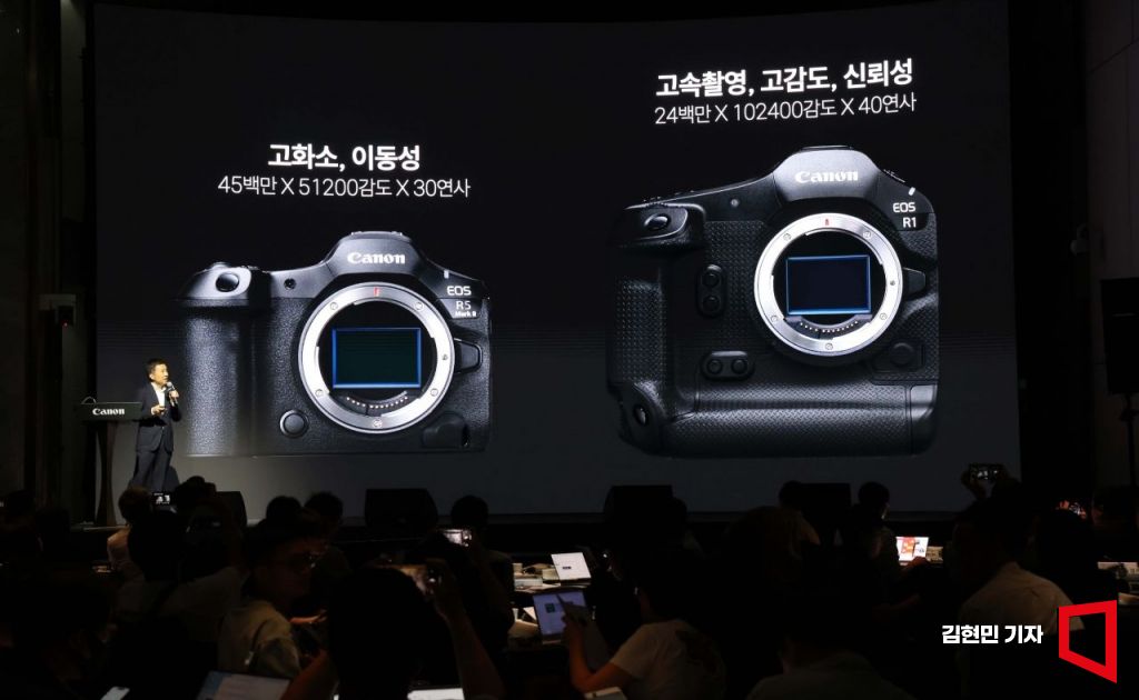 23일 서울 송파구 롯데월드타워 시그니엘에서 열린 캐논코리아 EOS R1 및 EOS R5 Mark II 정식 발표 기자간담회에서 박광열 매니저가 신제품을 소개하고 있다. 사진=김현민 기자 kimhyun81@