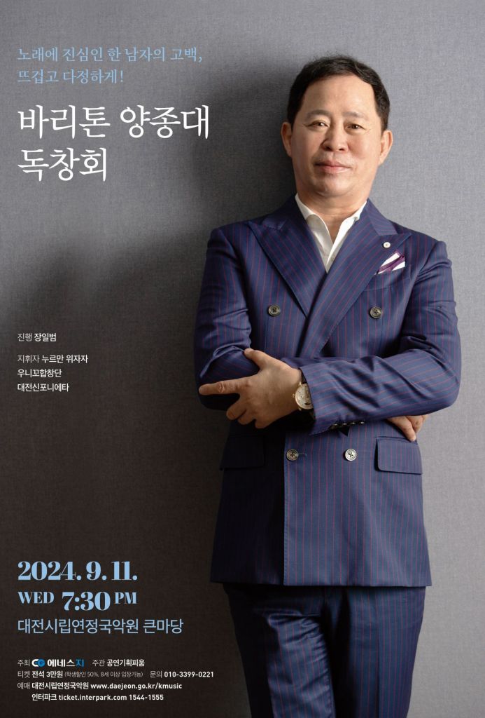 대전시립교향악단과 대전예술의전당 후원회 이사장과 부회장을 맡고 있는 양종대 (주)에네스지 대표가 오는 9월 11일 오후 7시 30분 대전시립연정국악원 큰마당에서 바리톤 독창회를 갖는다.