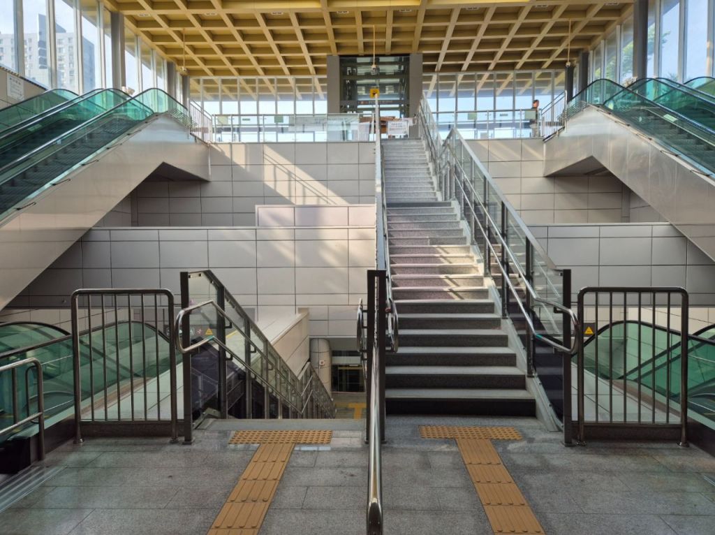 내부 계단은 지하 1층에서 중층을 거쳐 지상 1층까지 연결되는 2단 구조로 설계됐다. 계단 양 끝에 1.5m 높이의 안전난간 및 강화유리를 이중으로 설치, 이용객들의 안전을 챙겼다.