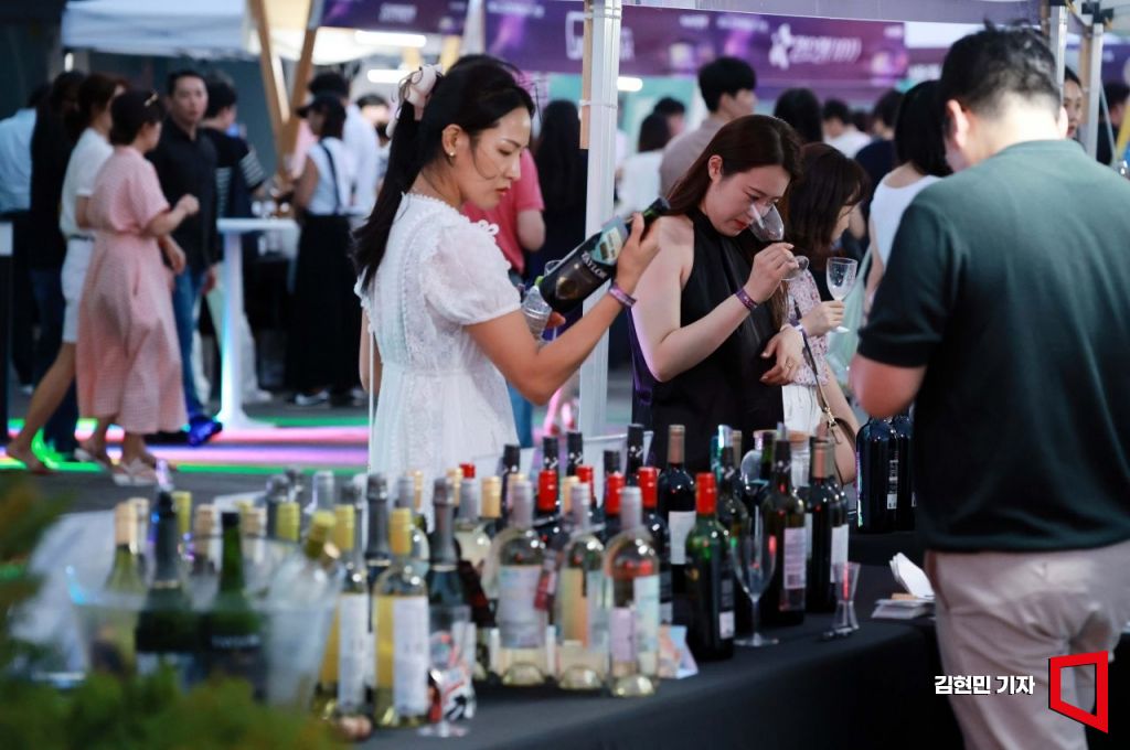 23일 서울 서초구 세빛섬 플로팅아일랜드에서 아시아경제가 개최한 ‘2024 글로벌 와인 앤 푸드 트립(Global Wine & Food Trip)’에서 참가자들이 다양한 와인을 즐기고 있다. 사진=김현민 기자 kimhyun81@