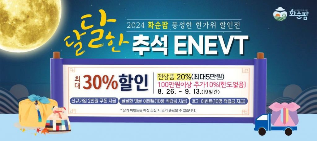 할인 이벤트로 화순 팜 회원에게 전 상품 20% 할인 쿠폰(최대 5만 원)과 100만 원 이상 구매자에게 10% 추가 할인 쿠폰을 지급하고, 신규 회원에게는 2천원 할인 쿠폰(1천 명)을 추가 지급한다.