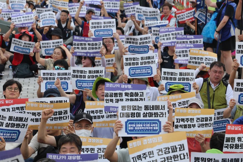 이서영 좋은공공병원만들기운동본부 사무국장은 집회에서 "의료취약지 주민들의 상황은 벼랑 끝"이라며 "수많은 의료취약지 주민들은 코로나19에 걸리면 받아주는 병상이 없어서 구급차를 타고 산 타고 강 건너 공공병원으로 이송돼야 했다"고 비판했다.