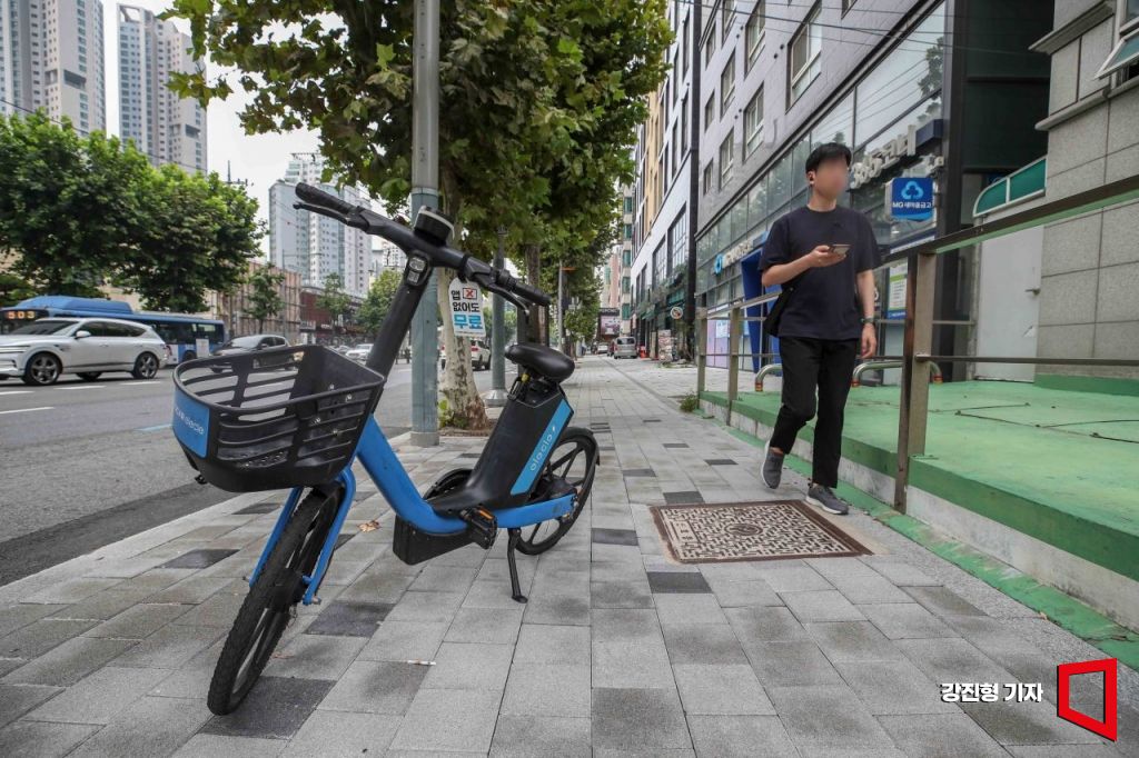 26일 서울 용산구 원효로에 불법 주차된 공유 전기자전거가 보도 통행에 불편을 주고 있다.
