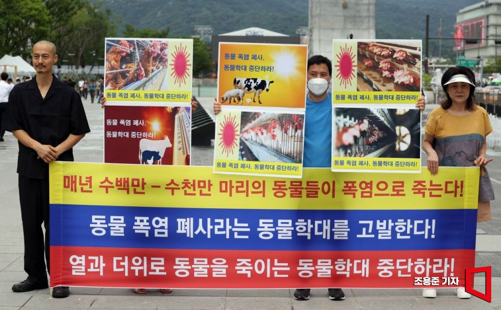 27일 서울 광화문 광장 이순신동상앞에서 한국동물보호연합 회원들이 동물 폭염 폐사, 동물학대 고발 기자회견을 하고 있다. 사진=조용준 기자 jun21@