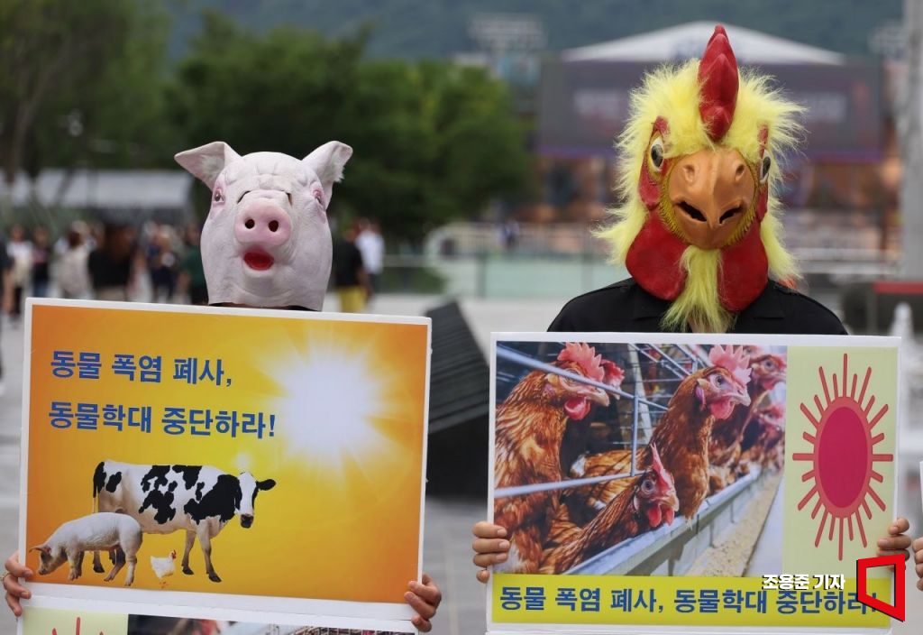 27일 서울 광화문 광장 이순신동상앞에서 한국동물보호연합 회원들이 동물 폭염 폐사, 동물학대 고발 기자회견 피켓팅 후 동물탈을 쓰고 퍼포먼스를 하고 있다. 사진=조용준 기자 jun21@