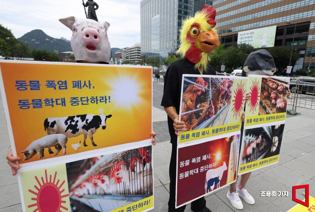 27일 서울 광화문 광장 이순신동상앞에서 한국동물보호연합 회원들이 동물 폭염 폐사, 동물학대 고발 기자회견 피켓팅 후 동물탈을 쓰고 퍼포먼스를 하고 있다. 사진=조용준 기자 jun21@