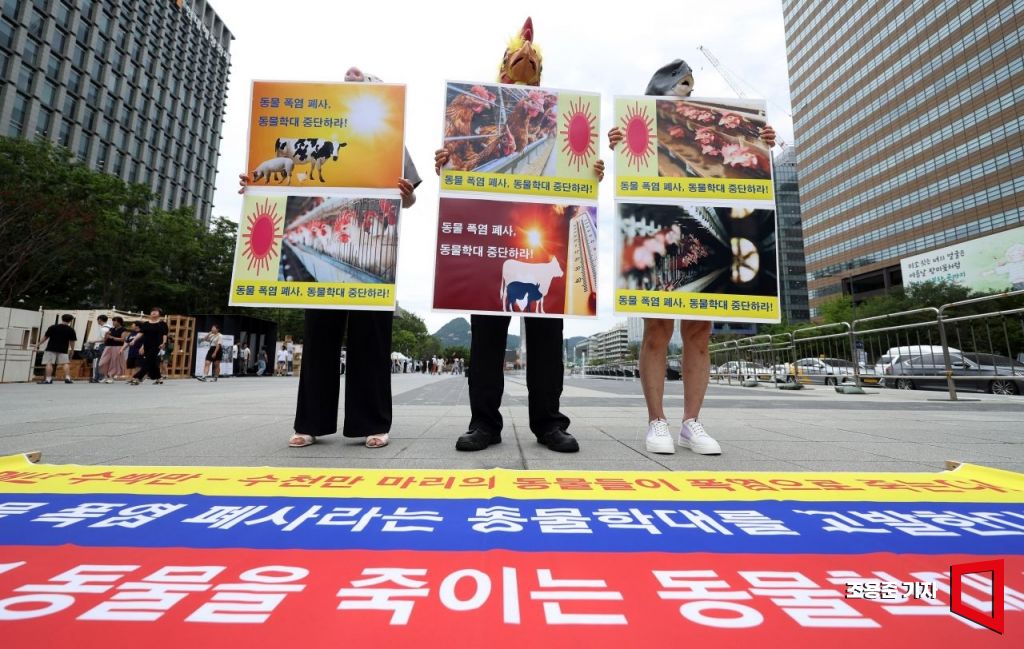 27일 서울 광화문 광장 이순신동상앞에서 한국동물보호연합 회원들이 동물 폭염 폐사, 동물학대 고발 기자회견 피켓팅 후 동물탈을 쓰고 퍼포먼스를 하고 있다. 사진=조용준 기자 jun21@