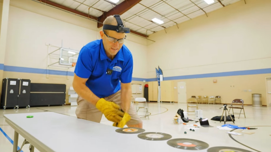 데이비드 러시가 '레코드판 깨기'를 하고 있는 장면. 그는 지난 1월 30초 안에 55개의 레코드판을 깨뜨리고 이 부분의 세계 신기록을 기록한 뒤 입증 자료와 함께 기네스북에 기록 등재를 요청했다. 사진출처=러시 유튜브 캡처.