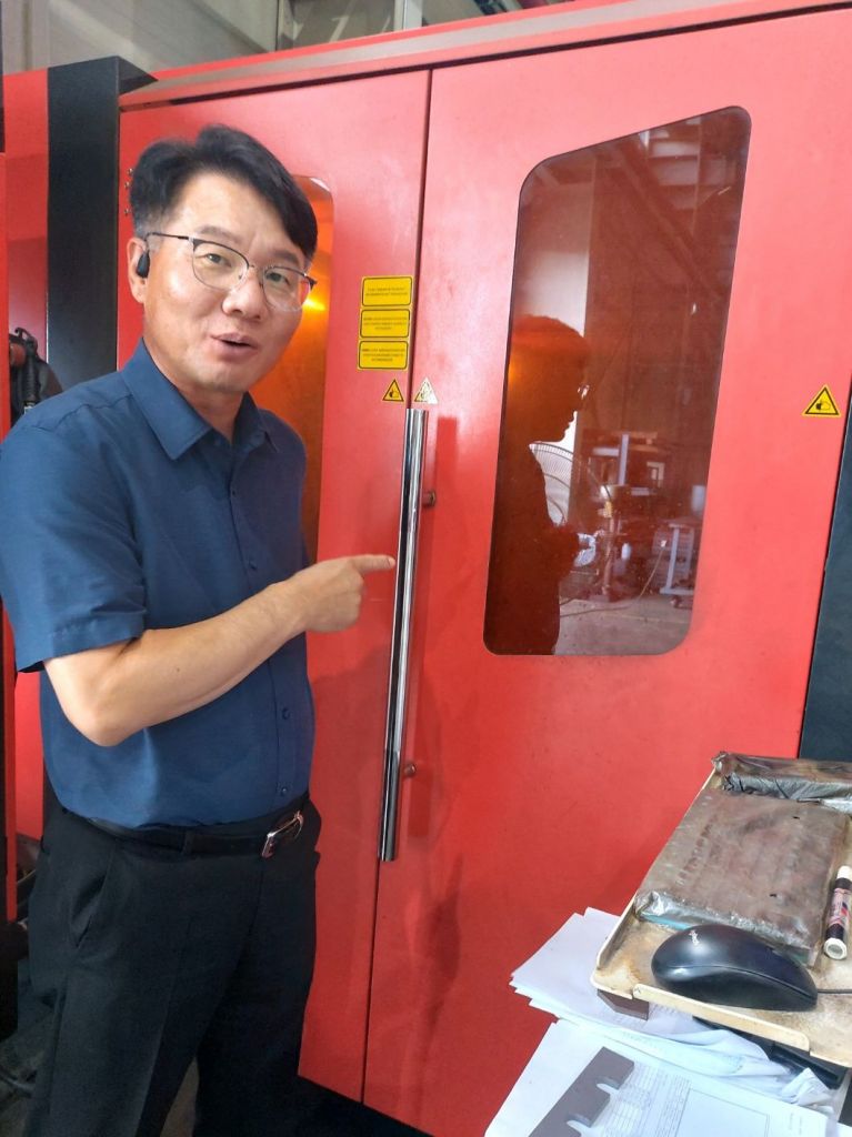 손영선 한국승강기공업협동조합 이사장이 자신이 경영하는 경기도 수원시 소재 (주)새한엘리베이터 공장에서 레이저 작업관에서 레이저로 강판을 자르는 과정에 대해 설명하고 있다. [사진=김종화 기자]