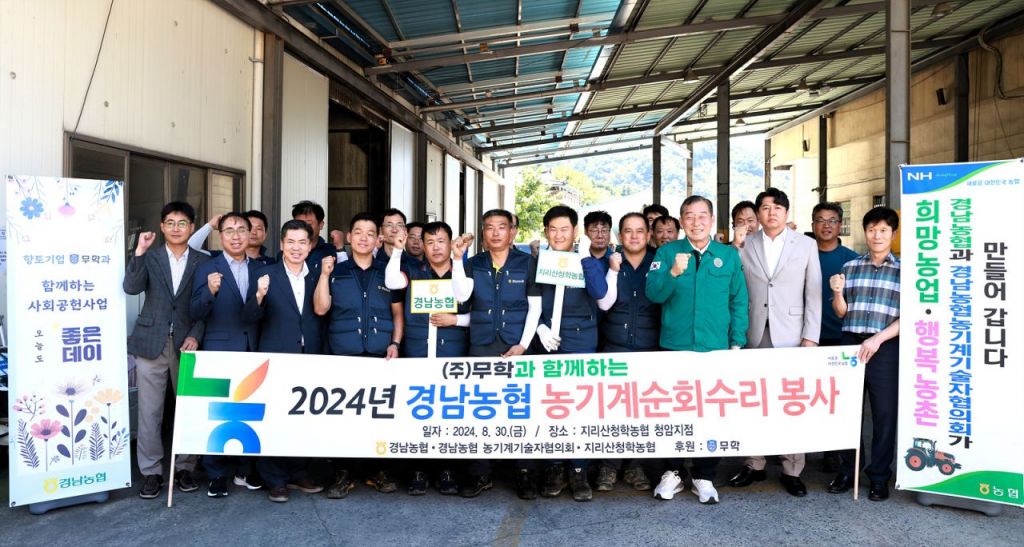 경남농협이 무학과 수확기 대비 농기계순회수리 봉사 기념사진을 촬영하고 있다. [이미지제공=경남농협]