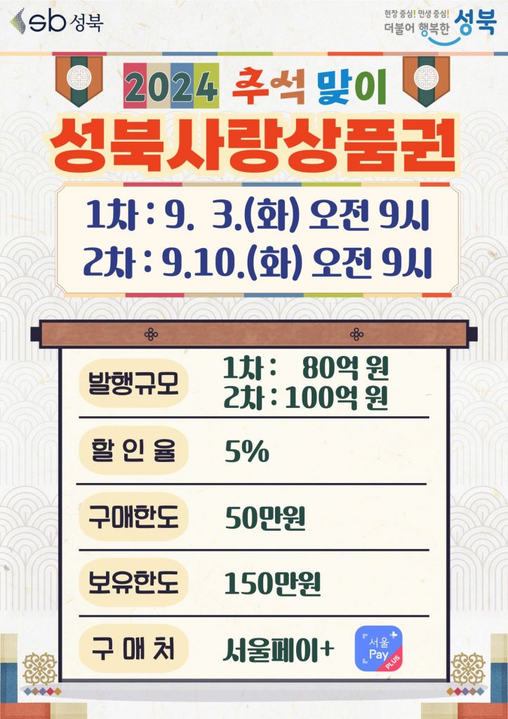 상품권은 5% 할인율로 발행되지만 9~10월에 상품권을 사용하면 5%를 다시 모바일 상품권으로 환급해 줘 사실상 10%의 할인율을 적용받을 수 있다. 페이백은 선착순이며, 상품권은 성북구 내 성북사랑상품권 가맹점에서 사용할 수 있다.