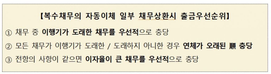 금융감독원이 채무자가 우선변제채무지정권을 활용해 채무변제에 유리한 선택을 할 수 있도록 안내를 강화해 소비자 권익을 제고한다. 우선변제채무를 미지정하고, 자동이체를 통해 복수채무를 변제하는 경우라도 합리적 출금 우선순위를 마련·적용함으로써 불이익을 사전 예방할 수 있도록 개선한다.