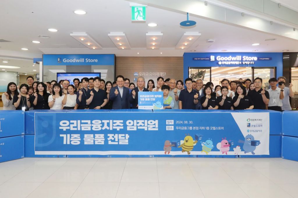 우리금융은 지난 5월 우리펀드서비스를 시작으로 3개월 동안 지주사를 포함한 15개 그룹사의 모든 임직원이 참여해 4만여 점이 넘는 굿윌스토어 물품 기부 릴레이를 펼쳐왔다. 지난 금요일 지주사 기증식을 마지막으로 기부 릴레이 대장정을 마무리했다.