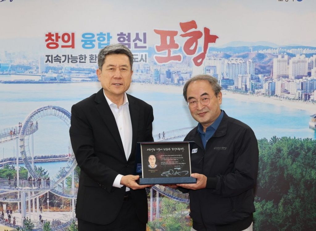 포항시에 2년 연속 고향사랑기부금을 기탁한 윤승의 삼성아스콘 본부장(오른쪽).