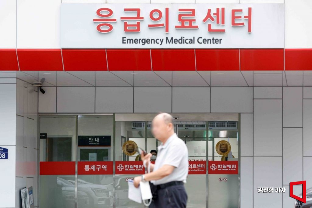 의료 공백이 장기화되면서 운영을 중단하는 대형병원 응급실이 늘고 있는 2일 서울 한 병원 응급의료센터 앞에서 내원객이 이동하고 있다.