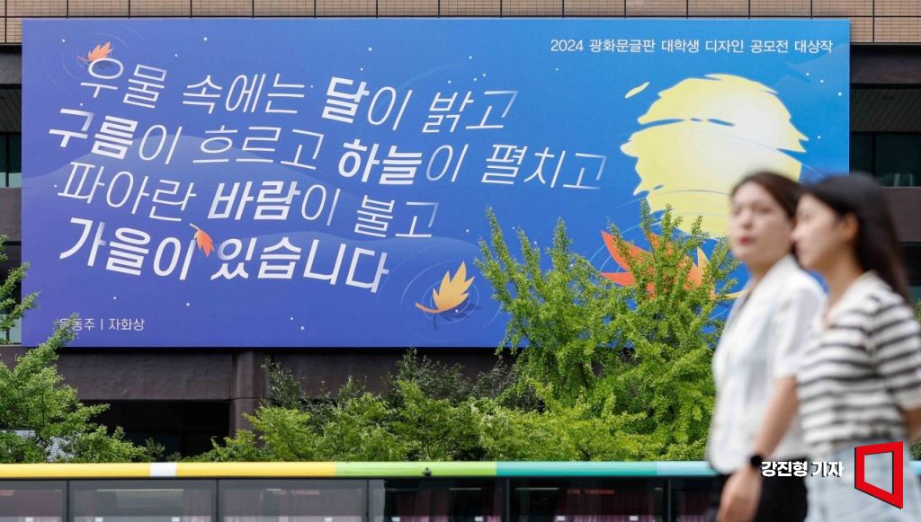2일 서울 종로구 광화문 교보생명빌딩 외벽에 윤동주 시인의 '자화상'에서 발췌한 112번째 광화문 글판 가을편이 걸려 있다. 이번 문안은 자기 성찰을 통해 희망을 노래한 윤동주 시인처럼, 고단한 현실에 처해 있더라도 더 나은 내일을 꿈꾸자는 의미를 담았다.