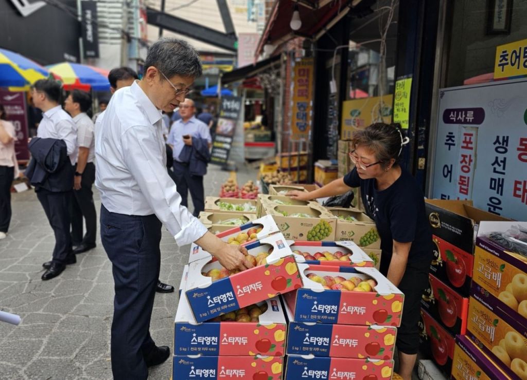 김동일 부산지방청장이 부전시장을 방문해 장을 보고 있다.