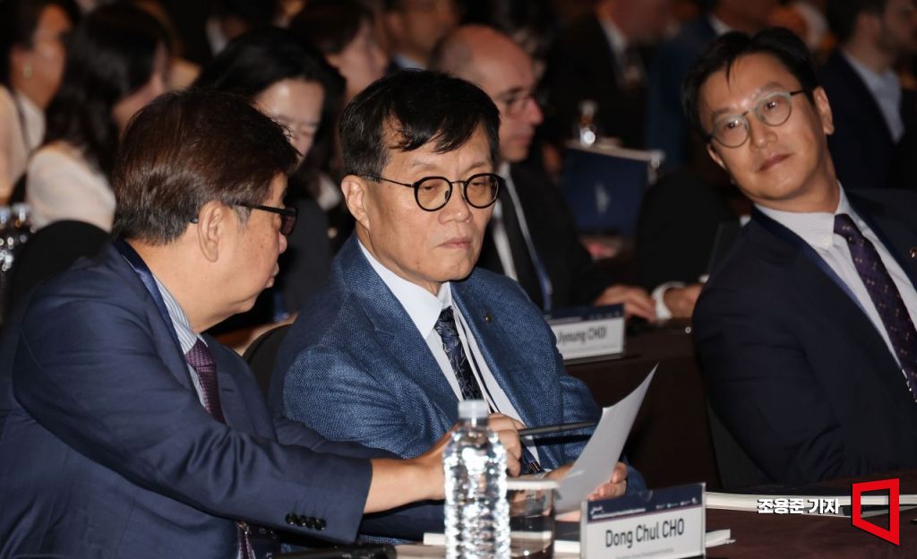 이창용 한국은행 총재(가운데)와 조동철 한국개발연구원 원장(왼쪽), 김범석 기획재정부 1차관이 3일 서울 중구 플라자호텔에서 열린 '2024 세계경제와 금융안전 컨퍼런스'에 참석, 대화를 나누고 있다. 사진=조용준 기자 jun21@