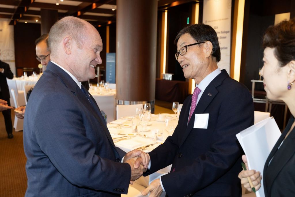 윤진식 한국무역협회 회장(오른쪽)이 크리스 쿤스 상원의원과 인사하고 있다. 무협은 4일 서울 용산구 그랜드하얏트 호텔에서 '미국 의회단 초청 한미일 3국 경제대화 네트워킹 리셉션'을 개최했다.[사진제공=무협]